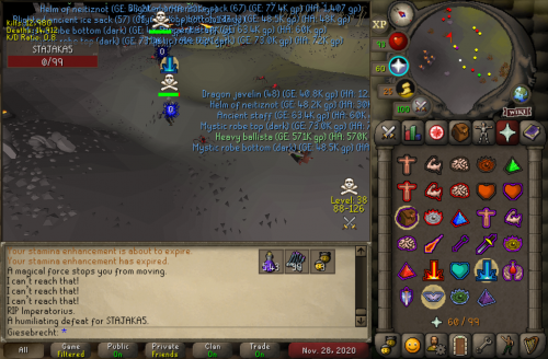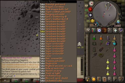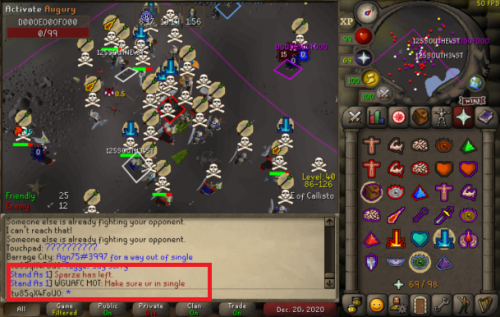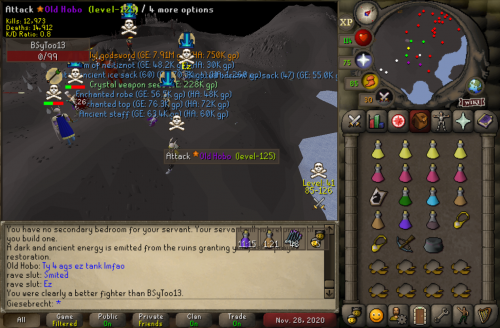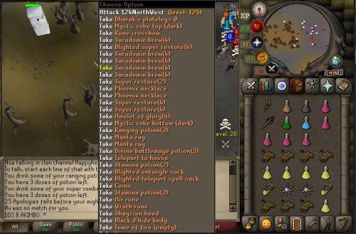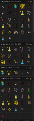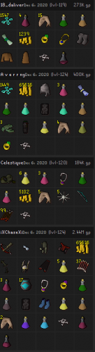 Headed out for a late EST PK trip after spotting all kinds of loot around the wilderness, after catching another few max mages slipping we moved around bumping into Team America and a few other random teams filling our looting bags before calling it a night. LATE NIGHT PART 2 With the Wilderness recovered after AC's hit earlier in the day, the AC late night unit pulled up to take back what was ours. Callisto was cleared of pvmers, forcing us to hit up Castle, where we bumped into VR. Unfortunately for them they weren't massed up with 3 other clans like normal, and were cleared in under a minute. Demoralized, VR did not return, and AC set out to hit the other wildy bosses. Soon after, VR went back up to castle in an attempt to pick up our scraps, but that didn't last long. AC pulled up to castle, forcing them through alley, where they were met by the other half of AC. VR was cleared in a single barrage clump, ending their trip for the night.