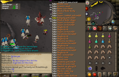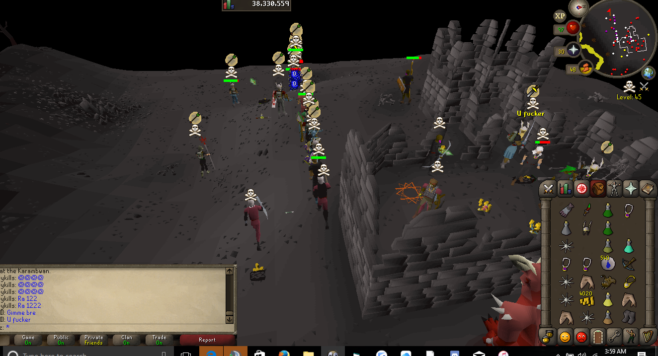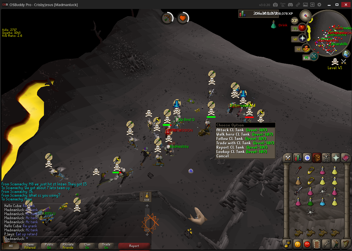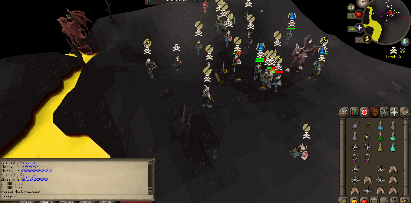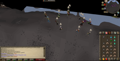Came on ts uchi and dro0 were pking, so me and jose join the fight of the wilderness not long after a few more buddys came thru and we had 9 ran into pd which they camped singles and killed a few of us Called up Ra leader for some back up and we cleared em up quick ting Next thing we know Cl starts attacking ra at gdz and the fight started between everyone We were dropping Cl like flys but they called a mandatory and next thing we know they have 30-40ppl +pd+ruin ragging us Thanks for the fight tho, Thanks Ra for the help