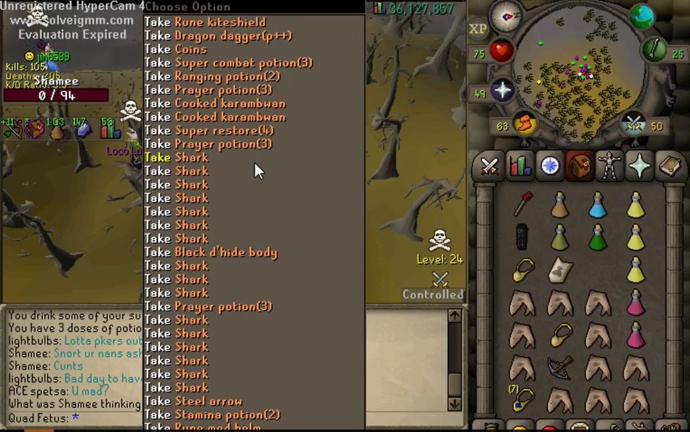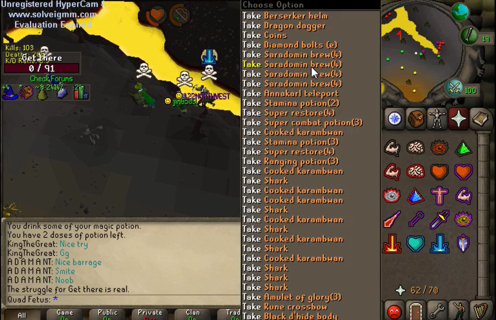 So a few of the squad and myself decided to run a little lure trip at Scorp hoping for some succulent l00tations. Little did we know that Scrilla was in the area. So on contact with Scrilla we instantly bend them over and send em running. After a few minutes of scouting we found them near RDG and unleashed the acts of Anus cremation. RIP Scrilla it was a nice try ;P Not to mention we had a small little spear trip to spider which ended up in a few V helms, a toxic staff, and a serp helm from some randoms. Thank you wild for your generosity.
