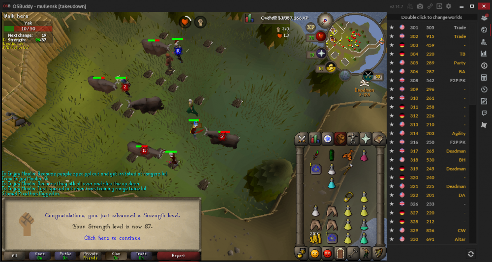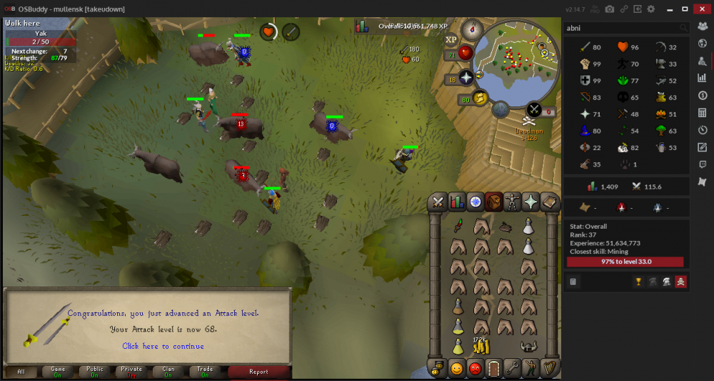 So we've all had some special place where we grind our lives away (cough cough Yaks, rock crabs, guards, goblins) cough! Is there a more efficient way to get things done and power level without spending an arm and three legs on firecape, dboots, whips, and rune knives for training? There IS! (note: this topic is only for those who don't have a meticulous and 'set in stone' training method and is serious about serious training :P) Let's just use Yaks as an example. Yaks have 50 hitpoints. If you are wearing moderate-strength boosting gear @ around 85 strength, your dscimmy max should be around 23 (dont quote me on that) For meleers to boost their XP/Hour, use super strength potions, they are only 3-4k for (3 to 4 dose potions respectively) They are definitely worth the price for the hours they last! use prayer flicking. Yes, this is only for the most serious of carpal tunnel contenders. I'll also give you another hint for you with the automatic gear switchers, hint hint, you can bind "F keys" to the Quick Pray button.. <<not gonna say any further than that or support it, however if one were to go against my advice, your wrists will survive a lot of abuse. Use ALL your special attack. Even if you are ranging, either switch to a magic shortbow or DDS... all the XP adds up! For you rangers, same as above, magic shortbow spec with rune arrows doesn't hurt once in a while, and over the course of 5 hours of training really adds up. For magers, I guarantee splashing is the cheapest XP you will ever get, ever, however I will list out the most common methods of magic training by XP gain. Multi-target barraging- up to 1.1m+ xp/hour (this method is dangerous as alll hell!!) locations: Bandits in the desert, Skeleton Monkeys Stun Alching- ~850k xp/hr (this method is safe, however, be very weary of misclicks! this method is expensive) Curse Cursing ~unknown xp/hr (350k xp/hr as far as I'm aware) this method is cheaper than stun alching, but will also mess your wrists up and risks you misclick-skulling (((From level 82-94 magic is it roughly 101,000 fire strike splashes. This will cost you roughly 1.3m GP. This is the cheapest method, only secondary to manually fire striking YAK COURTESY! If you are new to the Yaks and would like to avoid getting speccd out, don't allow your character to AFK/stand there. Yes, it's very close to the safe zone, and yes the level 110 with the whip standing next to you is drooling on his keyboard over your bank key. Yak trainers that have clans to back them go from 0 to 100 before you know what's going on, you're dead. Don't get lured!!! If someone at the Yaks skulls and runs north, don't run after him. Even if he's a low level/easy kill, do NOT cross that bridge: it's multi and there's probably a clan waiting for your bank. For Ranger: Don't Attack Yaks from across the pen/map when there's one right next to you. The other 3 guys next to you with the Dscimmies will highly appreciate that. For ALL: try to kill the NPCs as fast and efficiently as possible so more may respawn and the flow will continue. --->><<>>please remember, this is a Guide and Suggestion Topic. This is BY NO MEANS telling you how to train Yaks, please stick to what you feel comfortable to and use this for reference. Sources: the guy with 34 deaths and countless hours at yaks