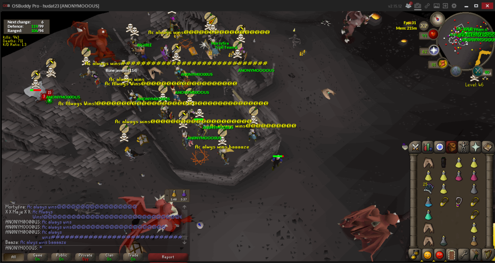 So we had a small 5-8 man team running around the wilderness terrorizing kids and red army appears at GDZ with 15+. We get a few more people to gear up and teleport up after 10 mins of fighting them we cleared them. Afterwards we fought some Wr members at GDZ but after there first death they were coming back up in rags and 1 iteming nonetheless we cleared them. So we continue to hop around and we had a little fight with Red Army at 50 ports again, clear them and after there first death they realized they couldn't take us and left. Good fight to Red Army and Wr. Good job to everyone who joined up and nice response time.