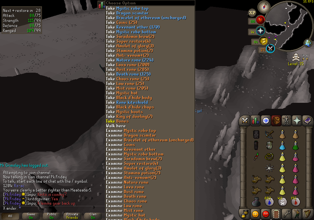 Wanted to share some tips and tricks for any newcomers to deadman, as well as anyone who simply doesn't know where to begin. These guides are pretty simple, not a lot of questing, and easy to follow. Before I begin, I wanted to go over the following important changes for this season, as well as what is and isn't in the game. See here for a complete list of all changes. The following quests will be automatically completed: Animal Magnetism, Death Plateau, Dragon Slayer, Heroes' Quest, The Lost Tribe, Monkey Madness, and the first stage of Recipe for Disaster. Ancient Weapons and Armor will be introduced into the game via drops for ALL wilderness bosses, obviously the higher the combat level, the greater your chance of receiving one as a drop. You will remember these items as Vesta's, Zuriel's, Statius, and Morrigan's from RS3. Tier 5 Emblems can be dropped by any monster over 100 combat, these can be exchanged for 1.5m Bounty Hunter Points, allowing you to buy an array of gear (Rune Armor, Dragon Scim, Looting Bags, Mystics, etc.) For those new to Deadman this season, there is a daily XP Cap. It works as follows: 750k XP averaged between Attack/Strength i.e. 500k strength and 250k Attack, 375k Attack and 375k strength, etc. OR 500k between Ranged and Defense OR 750k in magic. Prayer and Hitpoints do not count towards your cap. There are plenty of variants and different builds you can choose, I'll go over what I think can be some of the best below. Day 1 (Mage/Range Hybrid) -60 Magic -30 Defense -61 Range - Magic Shortbow - Rune Crossbow/Adamant Crossbow - God Cape/Staff of choice - Ava’s Accumulator - Climbing Boots Spawn in Varrock Get 10k from security stronghold, buy range armor/bone crossbow and bolts Home Teleport to Lumbridge, collect starter pack from Combat Tutors in Lumby Train on Cows using Starter Bow until 30 range or so. After this collect Anti-Fire shield from Duke in Lumby Castle, Ava's Attractor from Draynor Manor) Head to green dragons in wilderness, continue using starter bow until out of charges, then switch to Bone Crossbow. Continue this, collecting hides and burying bones, until level 61 ranged (302,288xp). Begin training Magic using starter staff, as well as buying Minds/Airs/Fire Staff. Magic isn't super great on Green Dragons, so I would suggest switching to Blues, as our crafter will probably be close to Blue leather by now. You will be capped out with 61 range, 60 magic and roughly 30 defense (Be sure not to train more defense than that or you won't be able to get 61 range/60 mage.) Once capped, you are now free to continue doing wilderness slayer for potential drops, and also go and complete your magic cape and god staff at Mage Arena. --------------------------------------------------------------------------------------- Day 1 (Melee/Ranged) - 60 Attack - 60 Strength - 40 Defense -50 Range - Dragon Scimitar - Adamant Crossbow - Dragon Dagger - Ava's Accumulator - Climbing Boots Spawn in Varrock Get 10k from security stronghold, buy Adamant Sword, bone crossbow. Home Teleport to Lumbridge, collect starter pack from Combat Tutors in Lumby Train on Cows using Starter Sword until 30/30/30 or so, as well as 30 ranged. After this collect Anti-fire Shield from Duke in Lumbridge/Ava's Attractor from Draynor Manor. Continue training on Big Frogs/Rats in Lumbridge Swamp to 59 attack/59 strength (260k xp in both) Head to Green Dragons and begin killing with Ranged until 50 Ranged, as well as 40 Defense, you'll now be capped. Complete Waterfall quest to finish off 60 attack and 60 strength. I feel this is one of the better builds to have on Day 1 for Multi-PKing, as you'll have overpowered DDS specs, as well as an adamant crossbow with emerald bolt (e)'s to poison. *Full Disclaimer, these are just merely suggestions, there are TONS of different routes to take in order to make money/train efficiently. However, with 12 seasons worth of experience, I'm a good resource to reference and am open to questions you guys may have regarding the season.