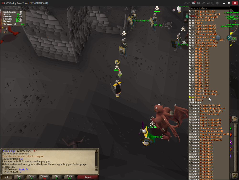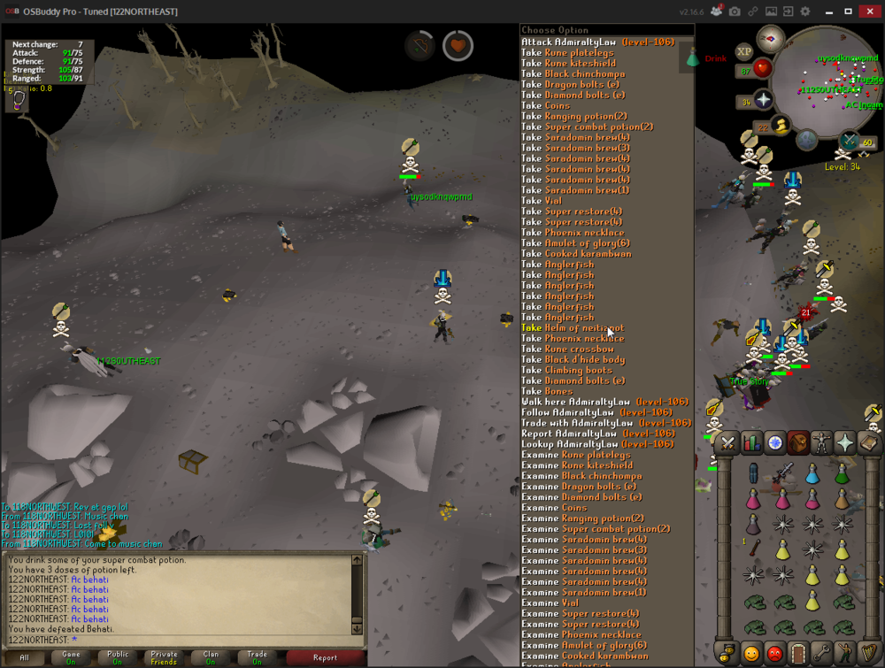 We started out the night pretty slow just clearing randoms but not seeing much action. Eventually we ran into Rev and the fight began with even opts. We started around dwarves but it soon moved to lavas and then to old gate. The fight was fought hard between both clans and moved back to GDZ and then to gap again. We fought really well and had the advantage through the whole fight but soon CT showed up to crash us so we teamed with REV to clear them. After about an hour and a half we called off the fighting and took and ending. Thanks rev for the fight and the clean action we had a lot of fun and look forward to do it again sometime. Proud of everyone who showed up and looking forward to our next scrap #AC