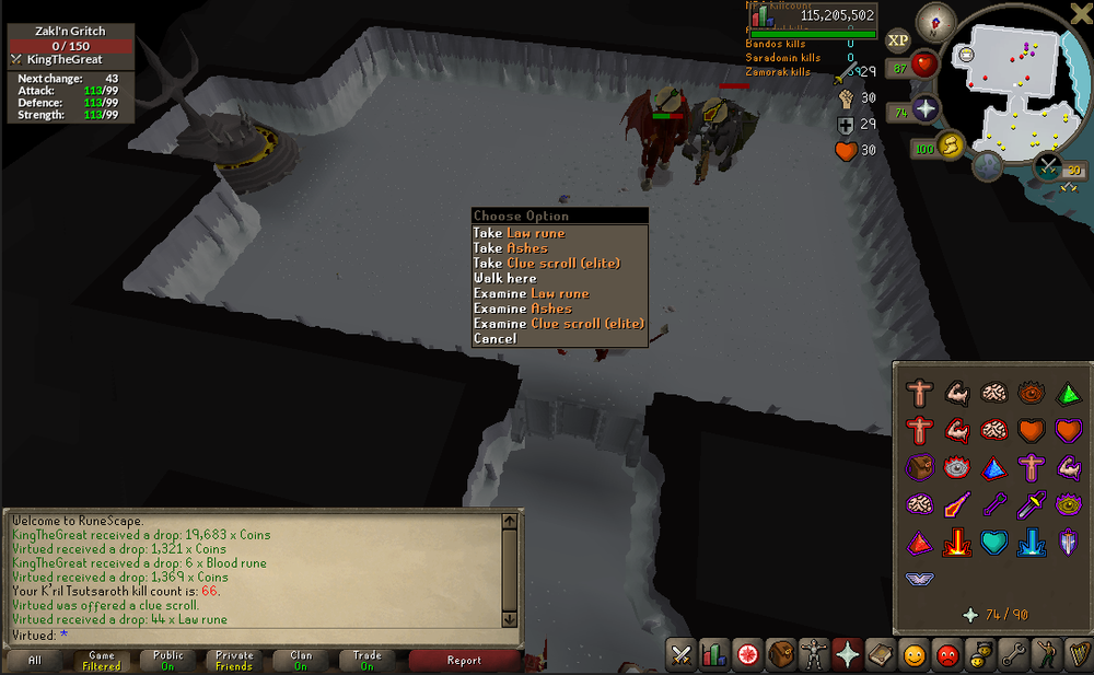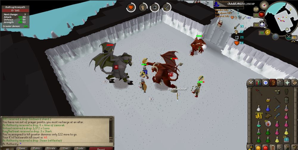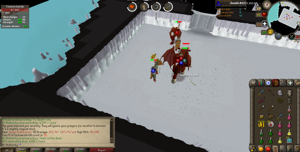 So, myself, Virtue, Tito, and AC Authority decided to go do some Zammy for a while. At first we were getting some pretty troll drops from Steam Battlestaffs to Godsword Shards, but by the end of the trip, we scored ourselves a Staff of the Dead. Was a fun trip and I even recorded it and will have the video up soon! Good trip guys!