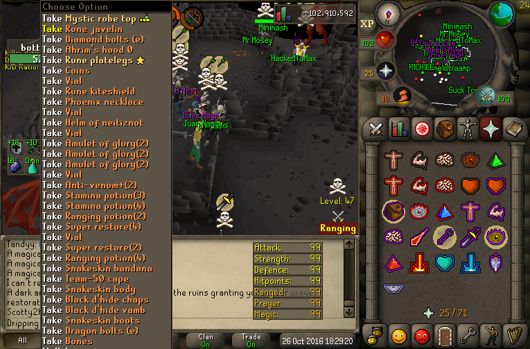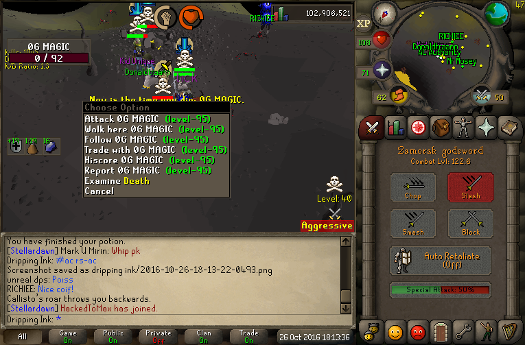 Dripping Ink Posted October 27, 2016 Share Posted October 27, 2016 (edited) So right after inners we decided to go out and see what loot we could find in deep wild. We started off at GDZ bumping into ROL quickly clearing them out, moved locations around Bear/ New gate and killed a bunch of newbs. Went back to GDZ and ended up running into infliction which lasted about 15 mins until they down geared and ended up fleeing the fight. Overall it was a successful trip and day, we progressed as a clan getting better in tanking, Calling, Transitioning etc with our inners, and showed what AC is about pking. Great job boys proud to be #AC Edited October 27, 2016 by Dripping Ink Link to comment Share on other sites More sharing options...